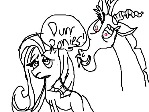 Discord utters with a face of sheer joy, " URRR! PONY!!". Fluttershy is contemplating her choice of frends.