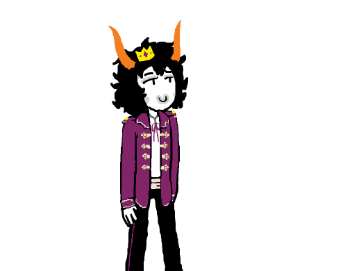 Gamzee dressed up like a royal. He has on a petite crown, a white undershirt with a purple tie, and a purple coat with gold buttons.