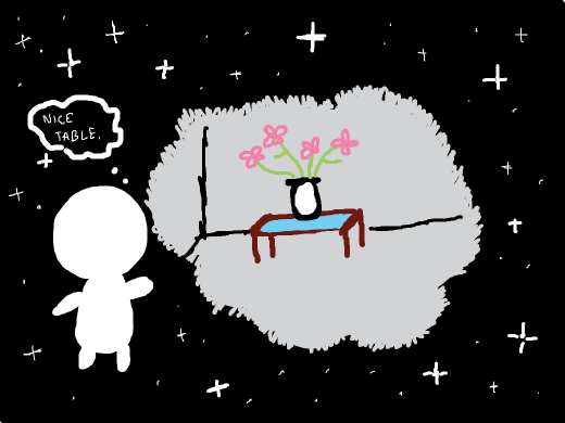 You're in space, looking through an interdimensional gray portal into someone's living room. They have a very nice coffee table.