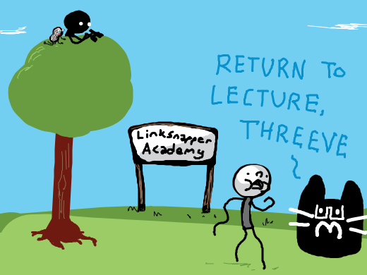 Wesester, Thriggle and Nut are spying the Linksnapper Academy but Prof. Haicat catch them and tells them to go back to lecture
