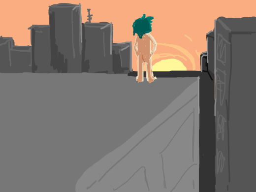 a naked man with green hair standing on the roof of a skyscraper watching the sunrise