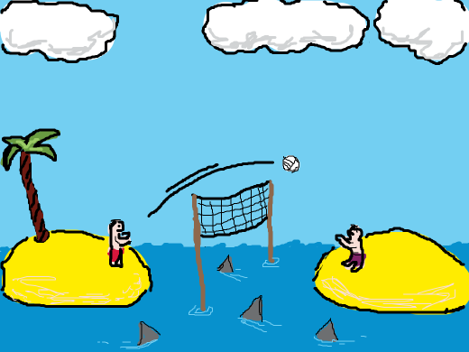 Shirtless people playing volleyball using a net between two islands. Sharks.