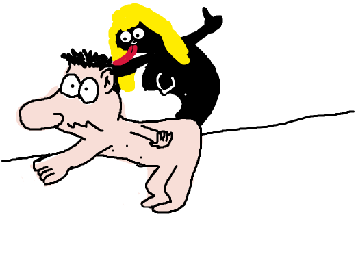 (oh LORD) a man with 3 legs/ 3 nipples/ 1 small arm and a nose almost the size of his face(naked) is being licked by a blonde lil kim