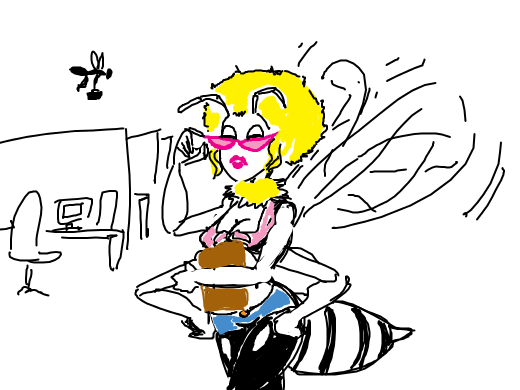 A worker bee girl during the daily grind wearing clothing that's questionably work appropriate.