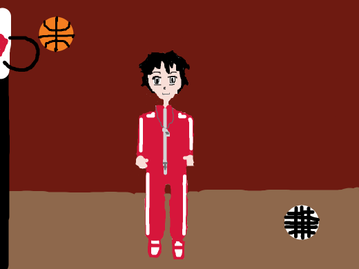 Budo in a male gym uniform standing in the middle of a gym as a basketball flies into a hoop